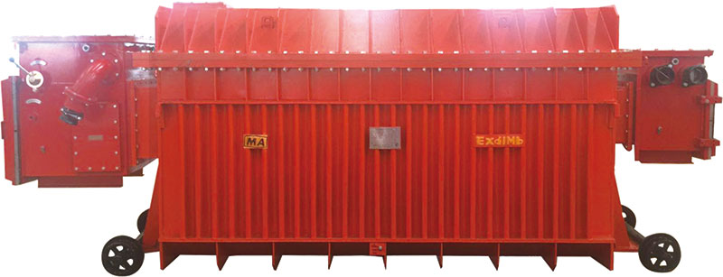 10kV或6kV電壓通過(guò)高壓斷路器、高壓屏蔽電纜進(jìn)入移變,把10kV或6kV電壓變成3.45kV或1.2kV或0.693kV或0.4kV,經(jīng)低壓屏蔽電纜和磁力啟動(dòng)器,為采煤機(jī)和皮帶運(yùn)輸機(jī)等電氣設(shè)備供電。它可以一臺(tái)單獨(dú)運(yùn)行,也可以兩臺(tái)并聯(lián)運(yùn)行。